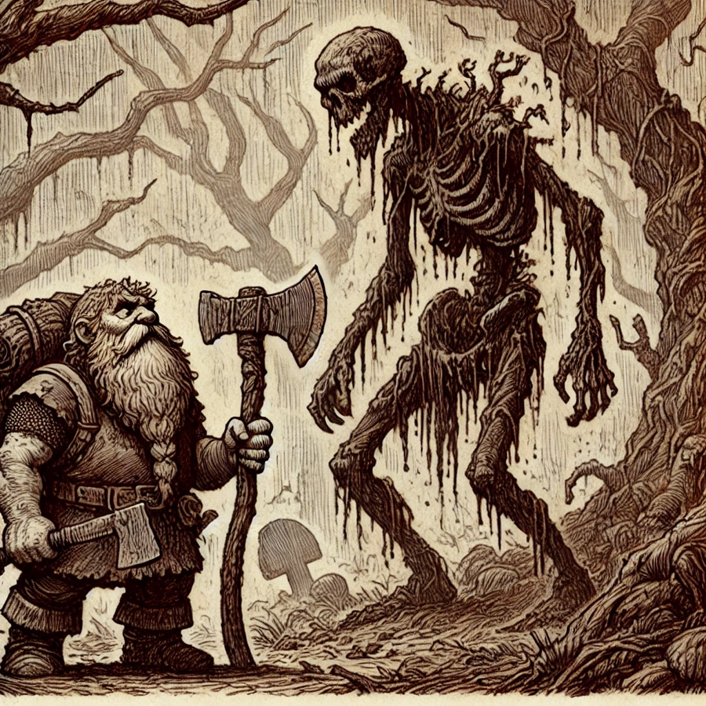 The adventurers, on their way to Baroldson’s farm, are ambushed by undead horrors, only to face a grotesque, fused abomination that rises from the fallen corpses, forcing them into a desperate battle in the eerie twilight."