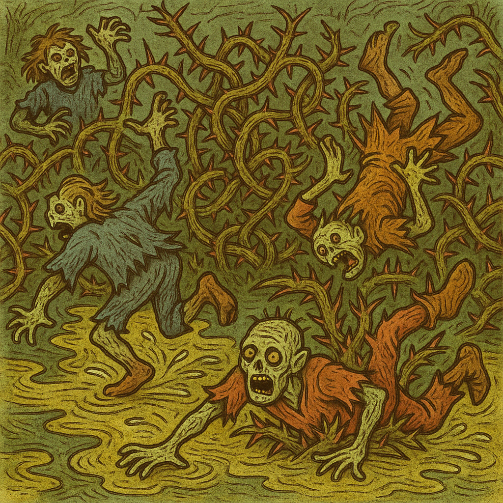 The party battles a horde of undead in the haunted bog outside Baroldson’s Farm, fending off zombies, ghouls, and a shrieking ghast while brambles, bees, and bravery turn the tide.