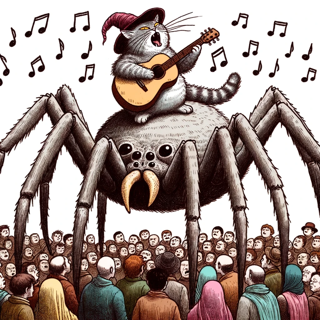 Desperate to sway the crowd to their side, Bartholemeow leapt atop the giant spider form of Waer’dara and broke into song, attempting to spin the situation as a morality tale of thieves getting their just deserts. But his performance failed to lift the crowd’s mood.