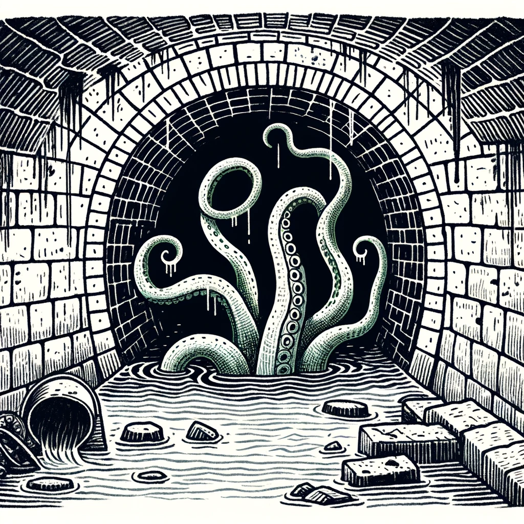 The party carefully navigated the southern side of the pool, with Pebblesong and Hat employing magic to mask the stench. Suddenly, a slimy tentacle burst from the pool, catching most of them by surprise. Bhakris, however, recalled a Waterdeep legend about a sewage-related scheme gone terribly awry.