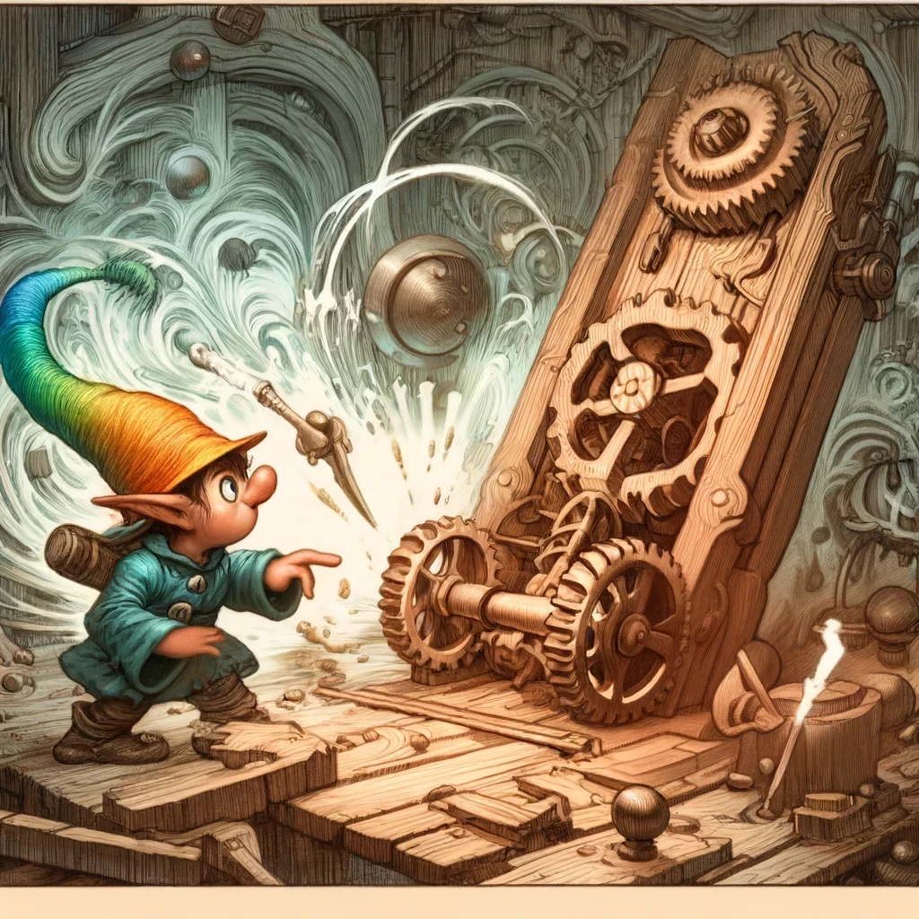 Hat, ever impulsive, darted into the room, spotting a well-muscled female in City Watch attire—Sergeant Teeshe—and the magical construct. The rest of the party surged forward. Hat’s quick study identified the construct as a masterwork mechanism designed for entropic destruction, now malfunctioning. A dwarf’s corpse lay among the rubble, a grim testament to its power.