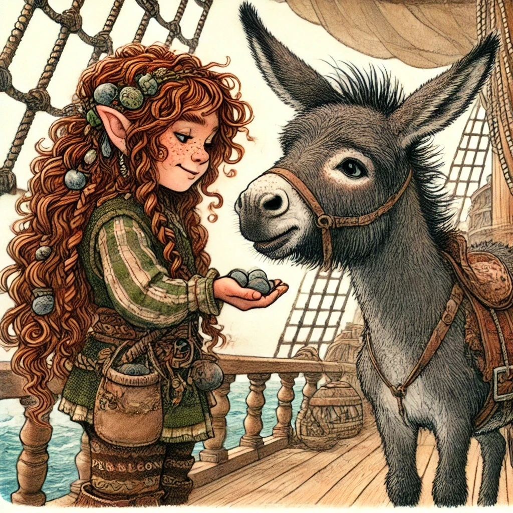 Pebblesong, ever the friend of animals, sought out Gus, the ship’s donkey. Using her druidic abilities, she offered Gus a goodberry and performed a ritual to speak with him. The donkey, voiced with a charming and sultry tone, shared a friendly conversation with the young druid, solidifying their bond through a spell of animal friendship.