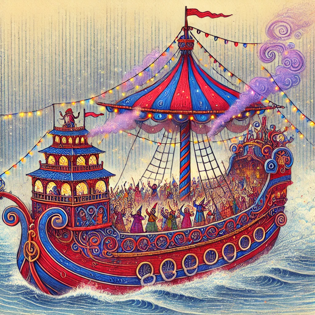 Back on the Wind Whisperer, Bhakris and Waer’dara noticed a peculiar sound began to echo across the river—a rhythmic thumping, growing louder with each passing moment. A large, gaudily decorated boat emerged from the mists, propelled by some unseen force as it cut swiftly through the water. Its red hull was adorned with intricate blue and purple patterns, while its deck teemed with revelers lost in the throes of celebration. A towering drum, manned by a dwarf, pounded out a primal beat, while the passengers engaged in an outlandish dance, their movements synchronized to the pulsing rhythm.
